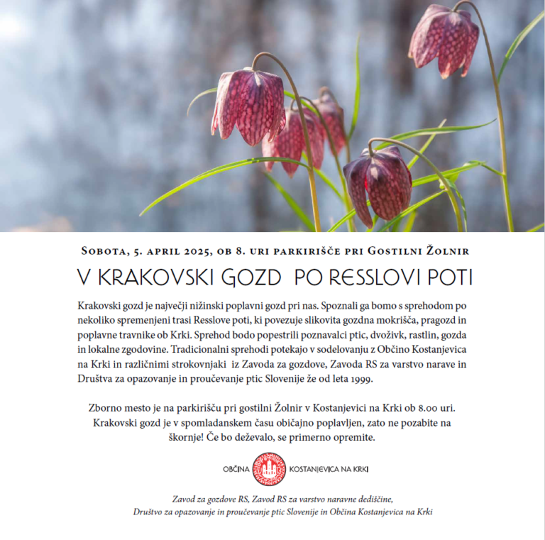 Vabimo vas na tradicionalni pohod po Resslovi poti skozi največji nižinski poplavni gozd pri nas. Sprehod bomo obogatili s poučnim predavanjem o podnebnih spremembah. Podnebne spremembe so pomembna tema za družbeno in okoljsko odgovorno destinacijo, Kostanjevico na Krki, zato je priložnost, da se podamo v naravo in se skupaj ozremo v prihodnost. Poznavalci ptic, dvoživk, rastlin, gozda in lokalne zgodovine bodo z nami delili svoje znanje ter nam popestrili pohod v naravi.