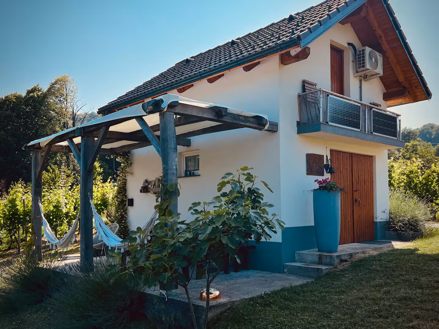 Four apartments in a well-kept wooden farmhouse set among wine-growing hills in Zavode, 4 km from Kostanjevica na Krki. A relaxing getaway in a natural setting.